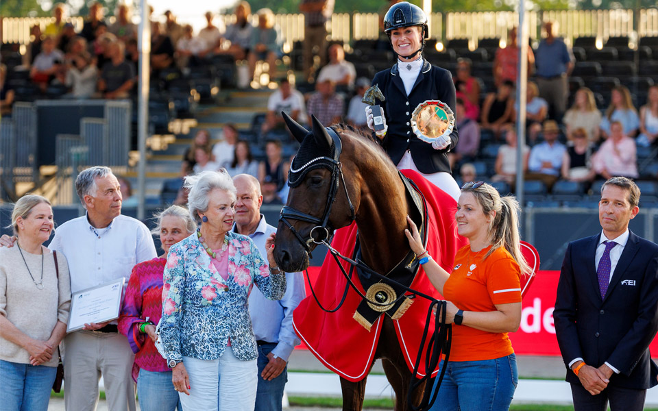 The fan club of Greta Heemsoth, a true ‘Verden girl’, could not have been more spectacular and louder. With a huge fan banner reading ‘Great, Greater, Greta’, they provided the final burst of energy, and Greta and the Hanoverian stallion Endorphin FRH put in a great performance. The Escolar son is not only the first horse bred by Ingo Pape to compete in a World Championship for Young Horses – he also brought home a medal. ‘Endorphin FRH was still a little tense in the first test, but today I felt he was super focused and really enjoyed his performance,’ enthused the rider. From Vice-Champion of Germany in 2024 to bronze medallist at the 2025 World Championships – with the following individual scores: 9.4 (trot), 7.9 (walk), 9.3 (canter), 8.5 (submission) and 9.2 (perspective). Endorphin was bred by Ingo Pape out of Harmony's Don Nobless daughter Donna Musica and remains in the ownership of the breeder.
