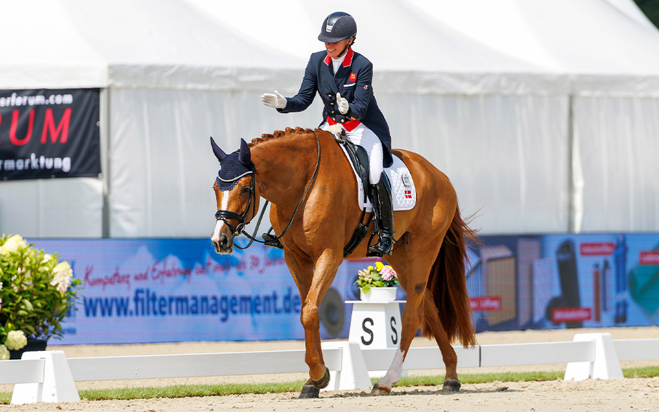 He is the first Trakehner since 2017 to catapult himself directly into a World Championship final: TSF Gaspard ND. The His Moment son did not manage a completely faultless round today under Cecilie Hedegaard, resulting in a technical score of 67.321 and 70.179 percentage points. In the quality assessment, the Trakehner stallion was even just ahead of Ilegro with 85.40 percent, compared to 85 percent. Like Charlotte, Cecilie has only been in the saddle of her World Championship partner since January: “In January, he couldn't even do flying changes,” the rider smiles. “He has developed so quickly and now here we are – it's unbelievable. He is very intelligent, really enjoys the sport and loves to perform.” She said she felt very good in the arena, but that there is still room for improvement. “I was really excited, it's my first World Championships,” admits the 24-year-old Dane. “For example, I rode really big circles. There's always something to improve.” The World Championship finalist was ridden by Dr Angelica Lauritzen, is owned by Nicole Derlin and had brought an extremely large cheering crowd with him to Verden. Gaspard's dam's sire Imperio showed how it could be done: in 2008, he won the silver medal at the World Championships for five-year-olds under Anna-Sophie Fiebelkorn, followed by the bronze medal a year later, and seven years later he travelled to the 2016 Olympic Games in Rio de Janeiro with Hubertus Schmidt as a replacement horse. But before Cecilie and Gaspard start thinking about the Olympics, they first have the World Championship final in the Horse24 Arena in Verden on Sunday at 11 a.m.