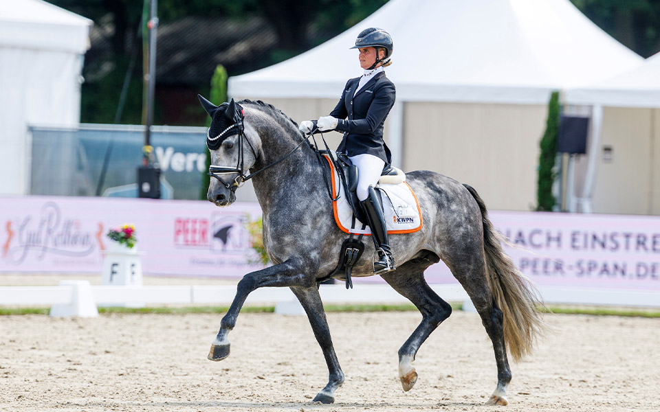 Tears glistened in Mette Sejbjerg Jensen's eyes: “‘He is simply fantastic! He is talented, beautiful and, at the moment, the best friend I have. FEI WBFSH Dressage World Breeding Championship for Young Horses”. “He” is the Jameson RS2 son Proud James. This fantastic horse was bred by Dutchman M. van Maasacker out of a Glock's Johnson dam and is owned by Helgstrand Dressage. The grey stallion had already made a big impression last year, securing victory in the final of the four-year-olds in the show programme of FEI WBFSH Dressage World Breeding Championship for Young Horses. At that time, he was still under the saddle of Maxi-Kira von Platen, but Mette has since taken over his training. “He's just incredible when you ride him into the arena,” enthuses the 36-year-old Dane. "He just seems to ask, 'Where do you want to go? Relax, I'll take you there.'‘ Even when she rode him for the first time, she thought: “Wow!” “He always gives me that wow feeling, the feeling that I could ride him to the moon if I wanted to." He is always very focused in the test, even today, and he has that certain show factor. “He enters the arena, grows five centimetres and thinks to himself: ‘Hey, look at me!’ He has incredible self-confidence and I love that.” Her conclusion after the first World Championship test in Verden with Proud James: “It was incredible! The weather, the arena and the horse!”